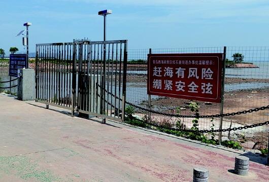 下午2時許,潮水已經開始回落,附近一些村民騎著車陸續趕往海邊。記者看到,海灘入口處已經安裝了一個大鐵門。大鐵門上還有一個擴音器,不停地提醒趕海要小心,不要被困淤泥。