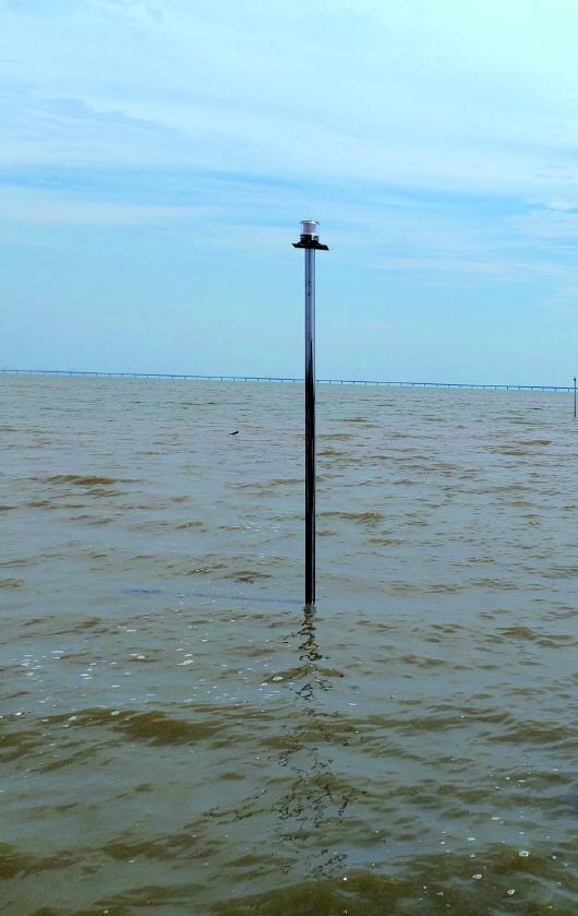 設置在灘涂上的路燈,遠處膠州灣大橋清晰可見